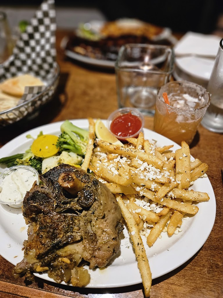 The food was okay. I think if you're looking for Greek it's alright. The tsaziki is pretty delicious. My lamb was greasy, but salad was great! Ribs are 100% not Greek and lasgna was alright (a little over the top on oregano.)The drinks were fine. The portions were enormous!