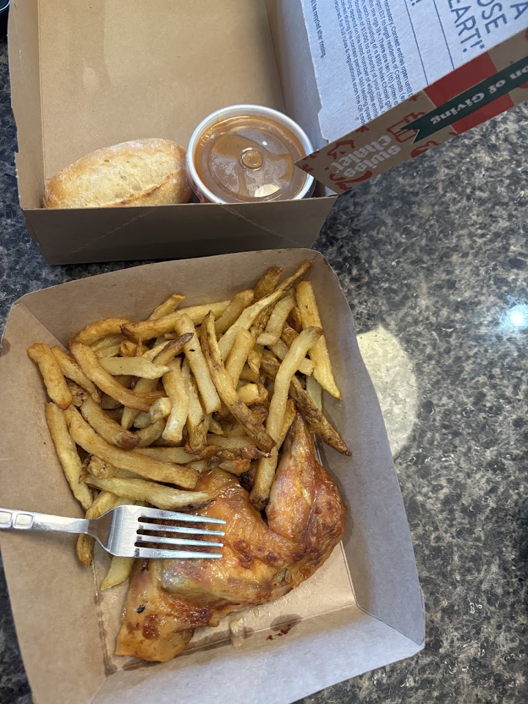 I got take out here around a week ago, and the take out girl had such good service. Kaitlin greeted me so enthusiasticly, and was very polite. Not to mention, the quater chicken I order with a side of poutine was very delicious. All in all a great experience.
