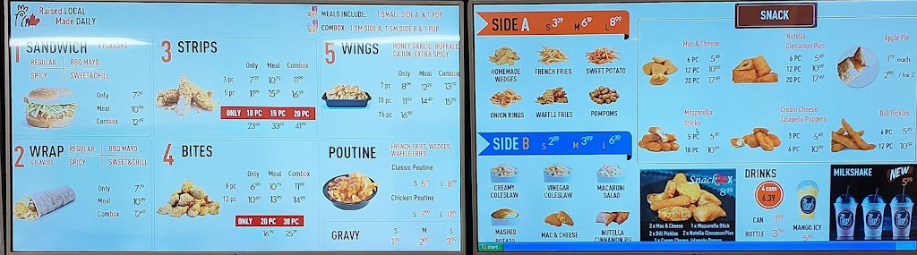 Great variety of chicken choices from regular to hot varieties as well as sides. I must return to explore more.