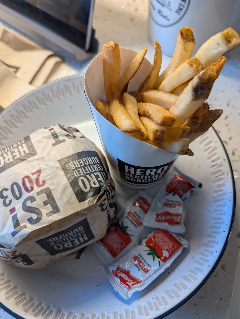 The fries were excellent. The two $6,99 burghers freshly made and tasty. An hour later my wife commented that she felt very satisfied. Often fast food does not last. I see some recent negative comments below. I know there are two challenges in retail these days. ( Three if you include costs increases) It's hard to get staff and the ones that do work are then overworked so less tolerant then they might otherwise be especially if the place is busy. It was quiet when we were there and we talked with the franchise owner. I wish there was a franchise closer to where we live , for sure we would use it regularly. Value? It would be interesting to hear from others but my experience with Wendy's, MacDonalds, Harvey's and A&W is that the 1/4 pound Hero burgher , with all the standard add ons for $6.99 is slightly better value than the others. Having said that, the bill with taxes was $23.28 for two burgers, one small fries and one fountain drink. Interestingly it also has icecream and butter tarts but I don't recall seeing tea or coffee options.