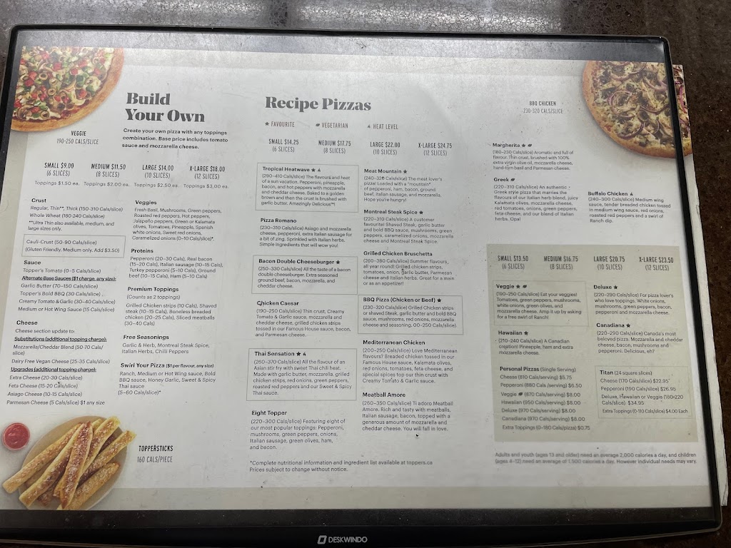 Whenever I think pizza I think Toppers. The pizza is amazing and the service is great. Their menu has lots of delicuous options and for the people that are used to cheap cardboard like pizza it might seem expensive, but believe me its not.