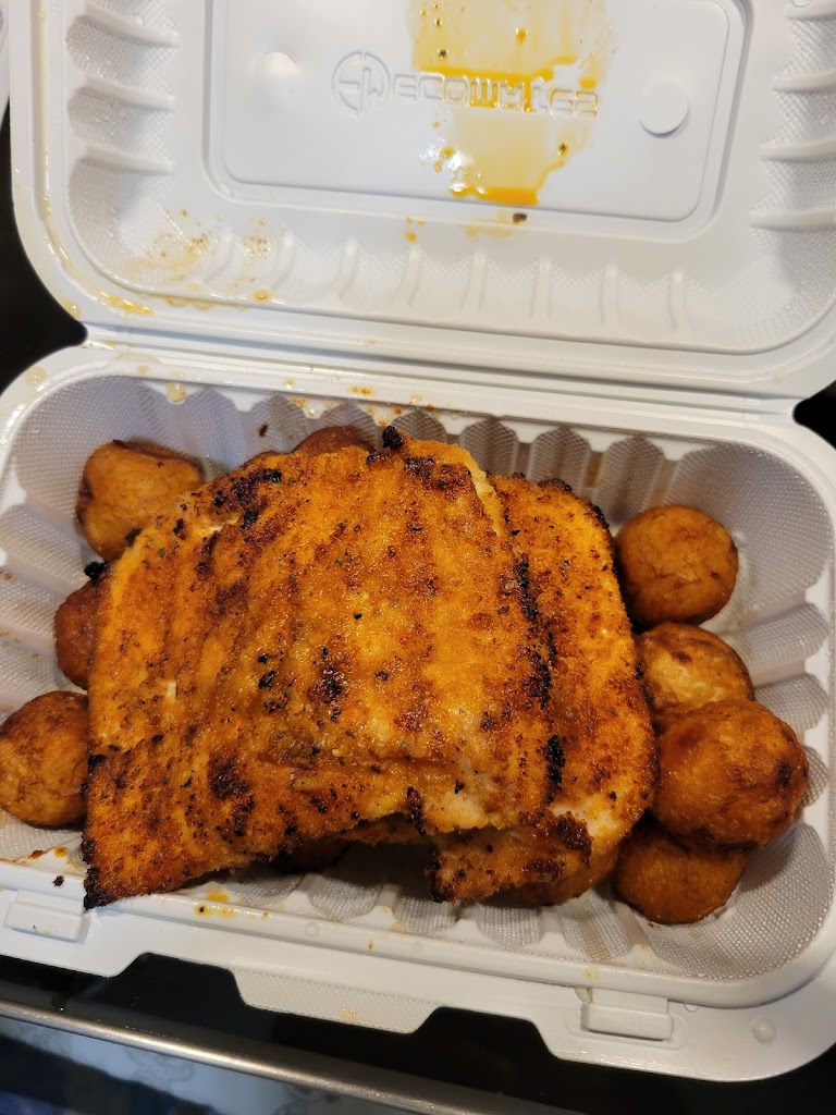 Very tasty food. Although the size of the chicken was very small, the sides were generous. I appreciated the choice of sauteed vegetables; mushrooms, peppers, and onion was great with chicken and potatoes. Cod cakes are a bit different from other places, but tasted good. Even on a Friday evening, food was ready in reasonable time.