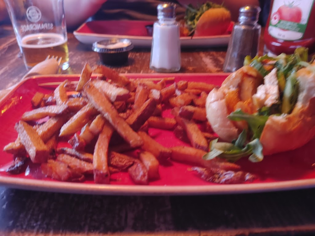 Very good hamburger and excellent calamari and excellent service. It was excessively hot inside and very noisy even for a microbrewery.