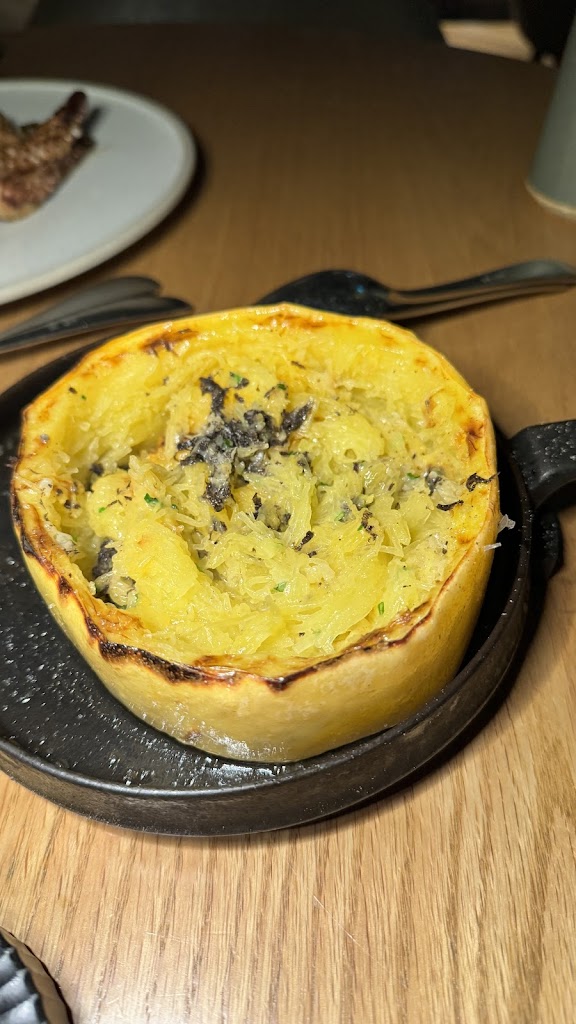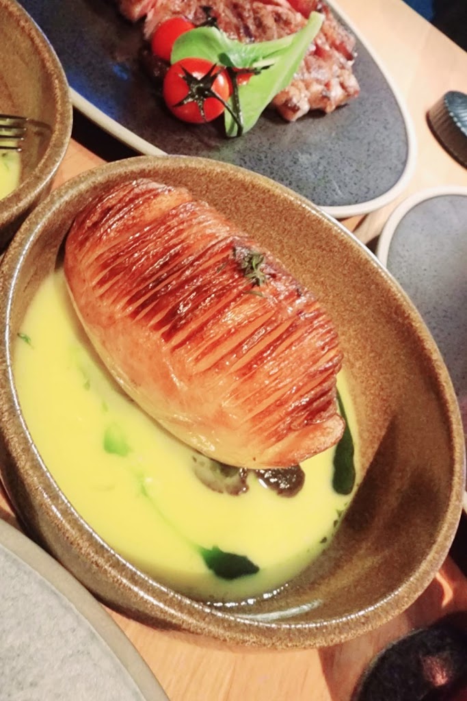 The food was amazing. Black garlic bread came warm and soft, and the garlic flavour was not too strong but a good aroma. We ordered brick chicken, wagyu skewer, and octopus for entree. The octopus is a must try, very tender, so do the wagyu skewer. For main, we ordered lamb and duck with the side of Hasselbeck potato. The lamb was cooked to perfection, juicy. I really enjoyed my dinner, especially the Hasselbeck potato. I will definitely come back and try all other entrees and the steak next time.