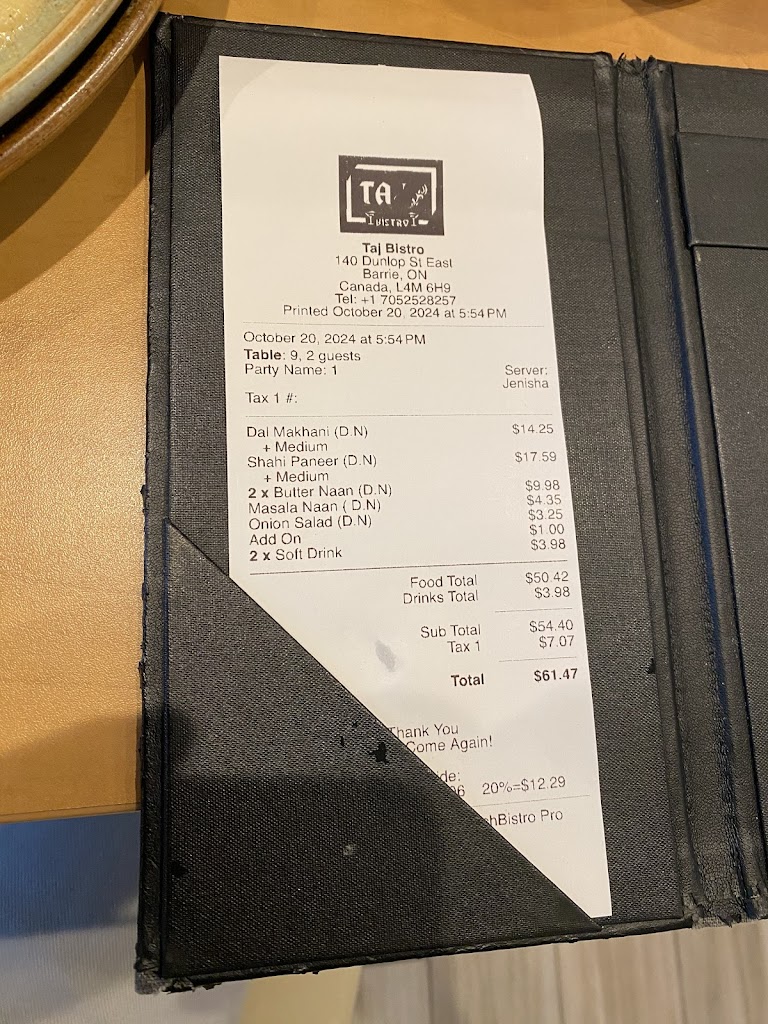 Taj Bistro in Barrie is a must-visit for anyone looking for a memorable Indian dining experience. Ordered for some delectable lamb biryani with butter chicken and garlic naan, and in order to flush down all the rich taste gotva glass of shikanji too.. In short, Whether for a special occasion or a casual outing, it offers an exceptional blend of flavors, quick service, and a pleasant atmosphere. I highly recommend it and look forward to returning!
