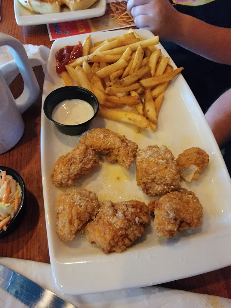 Our first time here, we are a family of 4 with young children. It smelled strongly of fried fish when we walked in, not a big deal- but still not pleasant. Our server was friendly, but so incredibly forgetful. We ordered the kids chicken bites which were decent, and the 3 course dinners one was a burger and the other the ribs really dry and over cooked- the fries were alright though. And the burger was about the most unremarkable thing ever. The pickle spears were really good though. The ladies bathroom smelled /looked like a washroom at a gas station. I felt cleaner before I went in.