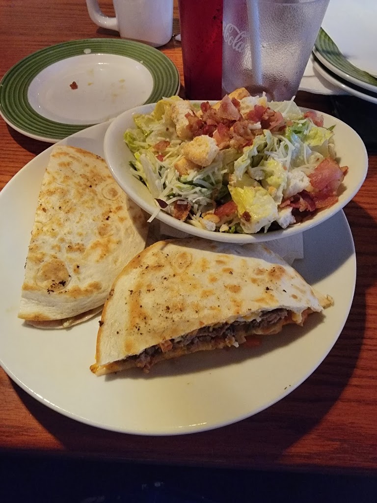 Got the quesadilla burger came out was not at all like the menu it tasted ok at best wife had quesadilla she side it was fine I am stopping at Wendy s on the way home to get enough food Was not very happy with the meal Food : 1/5