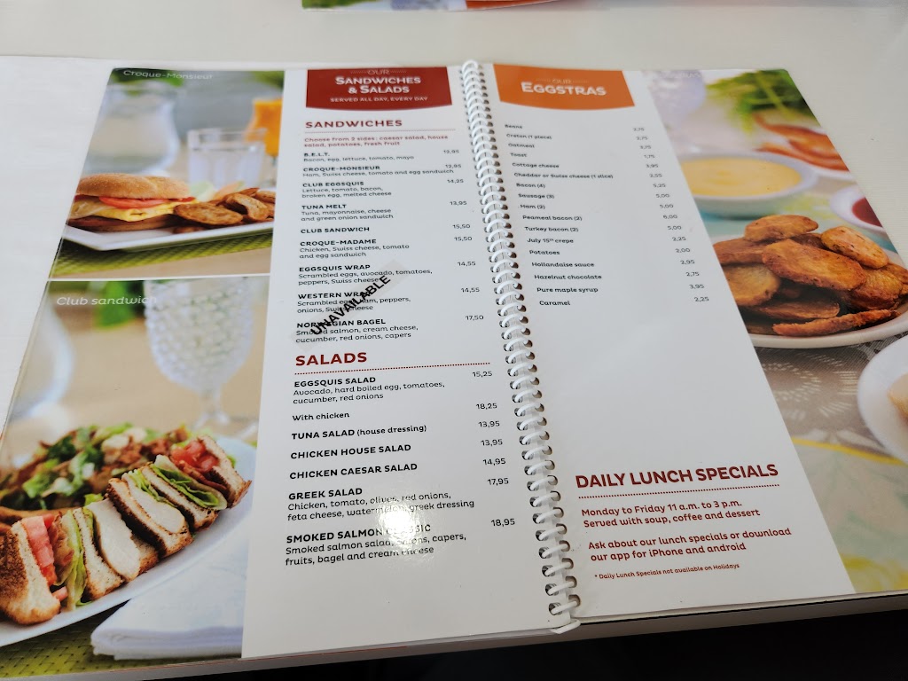 Ive been coming here for a few years now, and it will always be my favourite place to go for breakfast. I started taking my husband here and he agrees that the food is amazing. The service is always fantastic and the food is always fresh. You get a beautifully presented plate with more food than I can usually eat, all for a great price. This is the one restaurant that presents their food exactly like the menu pictures, and where you leave 100% satisfied and even energized. My go-to and recommendation is the crêpe royale with hot chocolate, I think youll love it. Eggsquis is a great place for everyone; a great place to take the family, a friend and even a date. Will be coming again soon!