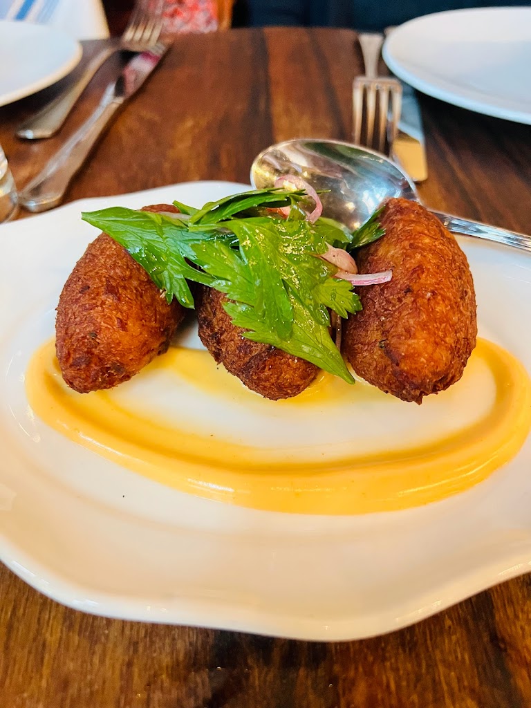 First visit, there were two of us on a Friday evening. Very well received, very good service. We had the caldo verde soup, good but lacking a bit of taste. Beef pintxo, succulent. Shrimp croquette. Delicious Green salad. The salad was a little bitter... but good vinaigrette Thanks to the team for the service