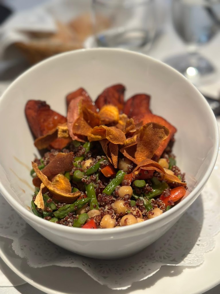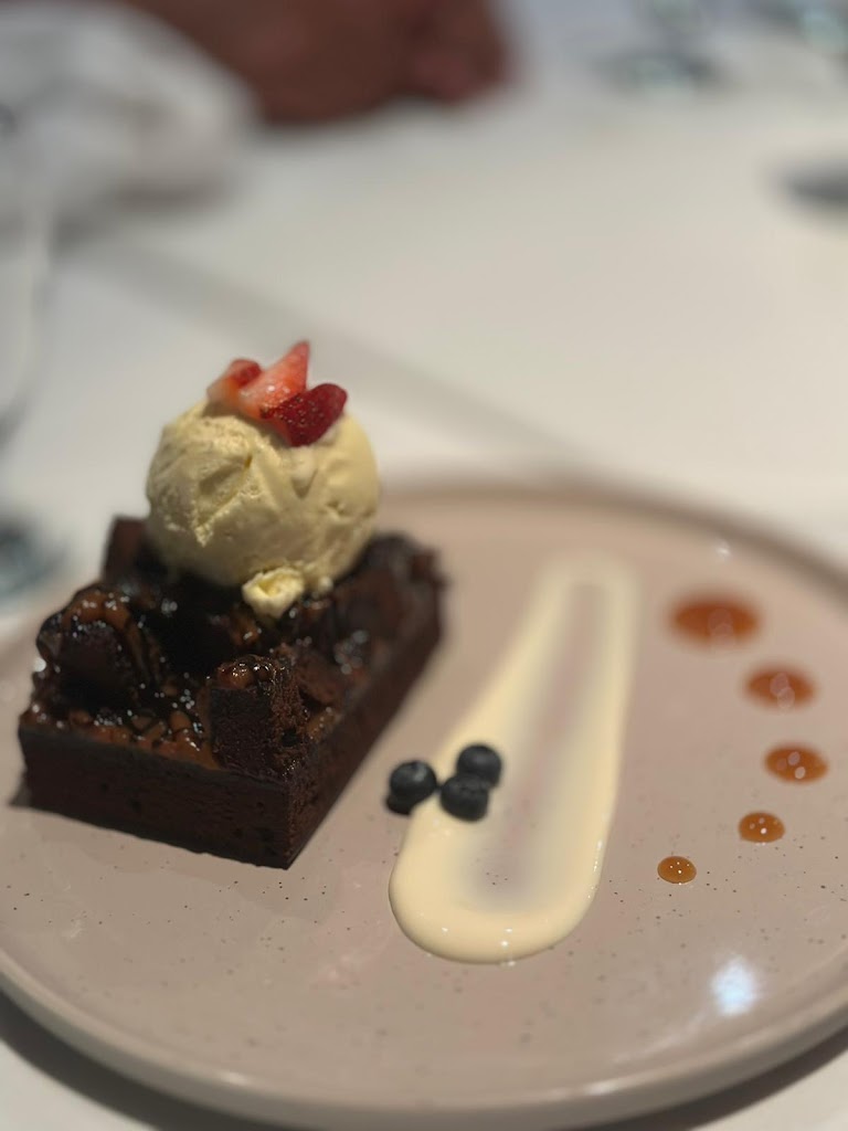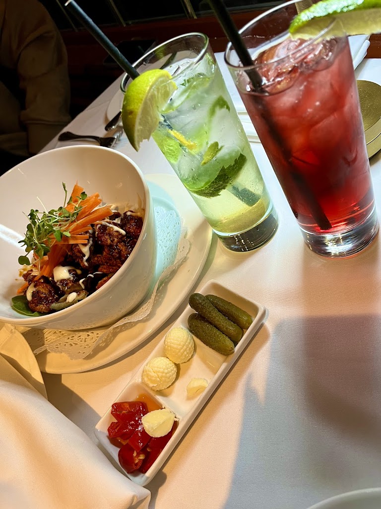 Service was quick and the food was very good. We ordered cocktails, french onion soup, chicken tapas, brussel sprouts, crab cakes. For mains, I ordered a vegetarian pasta (kale and roasted garlic agnolotti). I was very happy with it, but too full to finish it. My husband ordered the NY strip, which was also good. For dessert, we shared the chocolate brownie and a coffee. I think the brownie should have come with extra ice cream haha but that s just my preference. The atmosphere was nice for an intimate dinner as the music wad not loud so we didn t have to talk loud. Overall, it was a great experience with great service and I look forward to going back in the summertime.