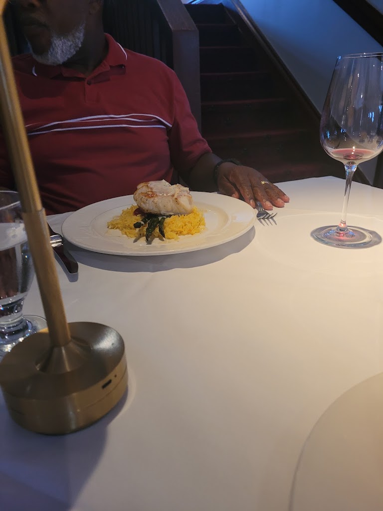 Nicely tucked away in a treed and somewhat secluded area, this restaurant ozed elegance. Our table attendant, Ricky, was a treat. He was professional, offered helpful suggestions and made us feel welcome. The food..... ah, the food was excellent. We had salmon and seafood platter and, it was very appetizing scoring a10, for appearance and taste. All in all it was an enjoyable evening in a location off the beaten path. My only suggestion would be the addition of quiet background jazz or music of some sort. Parking: Lots of available room. Two tour busses were there and there was still ample parking available Wheelchair accessibility: Ramp leads to the entrances.