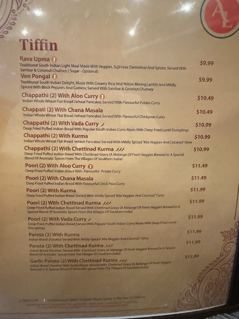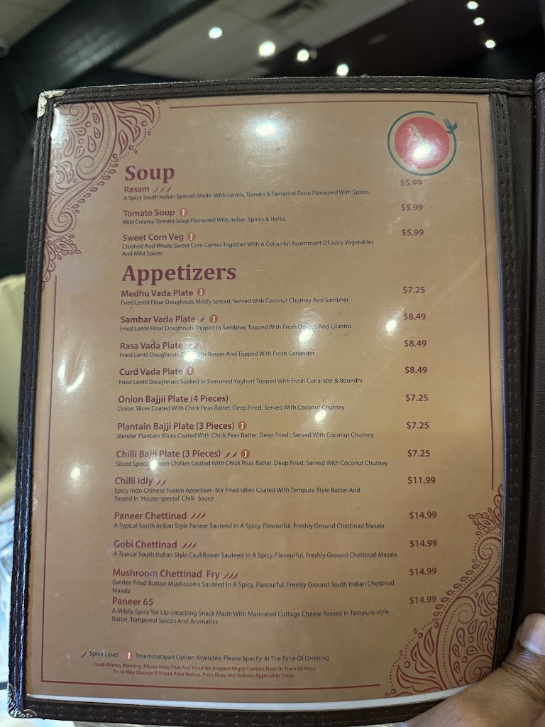 I ve been to this restaurant three times not because the food was good, but because I wanted to see if I was missing out on something great, given its high rating of over 4 stars. Unfortunately, each visit was disappointing. Here s what went wrong: Bajji: It was way too oily. When I mentioned it, they admitted the chef was new. Parotta: They claimed it was freshly made by a parotta master, but it was clearly reheated and store-bought. They said the chef was on leave. Cauliflower : It was terrible. The batter was undercooked, and the pieces were too big, like no effort was put into it. Cheese Dosa: This was the worst I ended up hating cheese after eating it. Idli : It was not hot and was hard. Paneer chettinad : This was the only dish that was good compared to other varieties Madras Fried Rice: Too oily, no vegetables, just few onion leaves were present. The food here lacks quality, and I m shocked by the positive reviews. I won t be coming back.