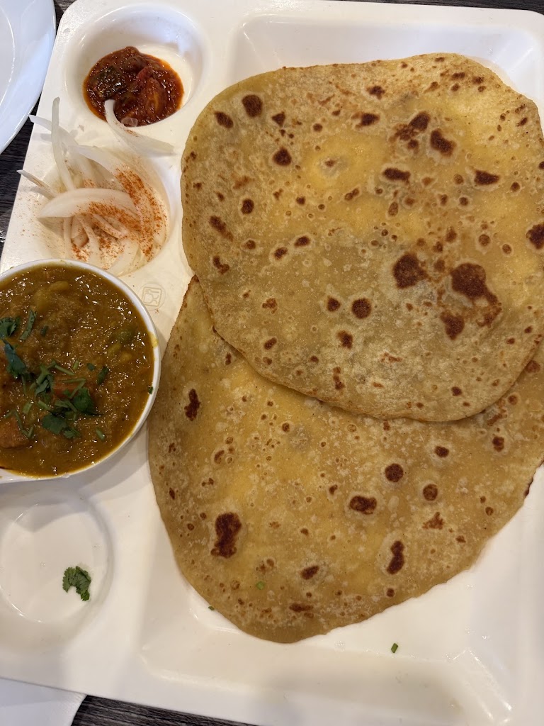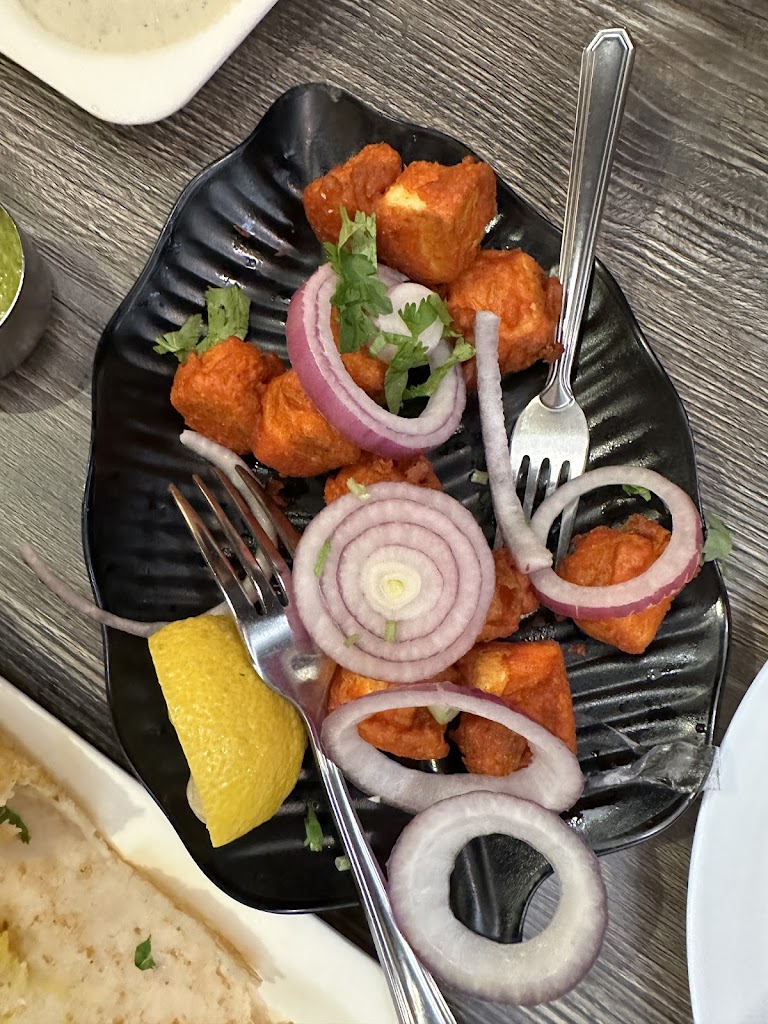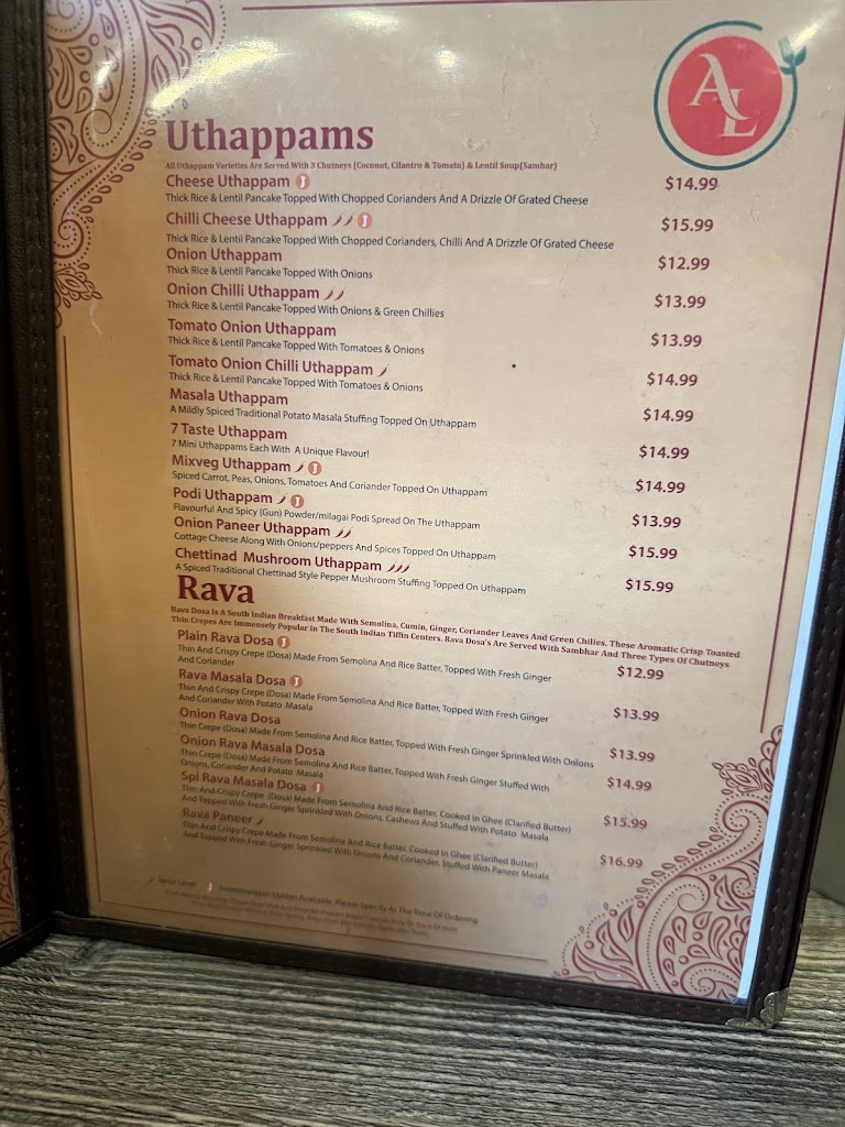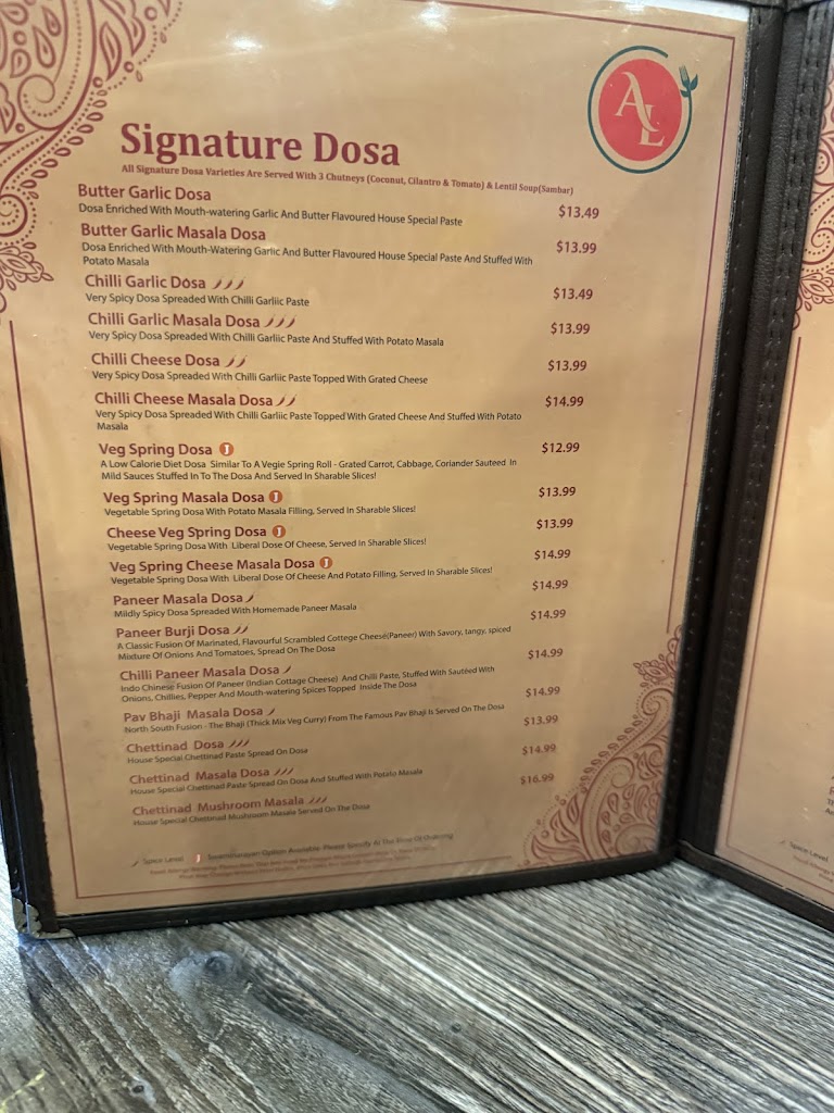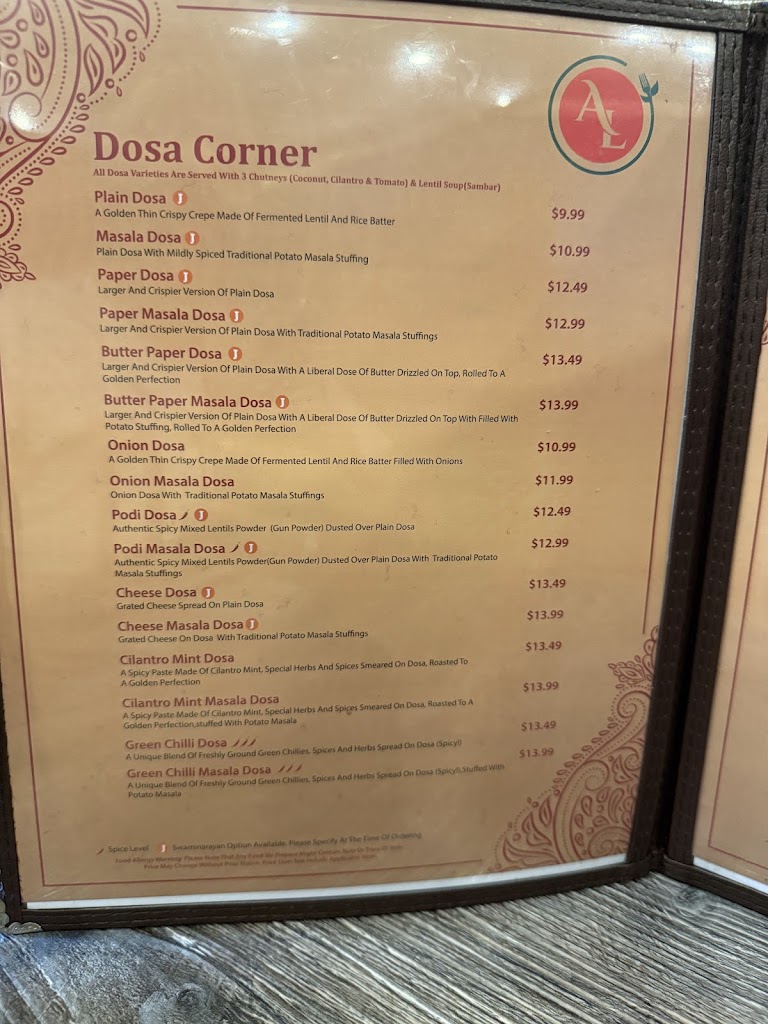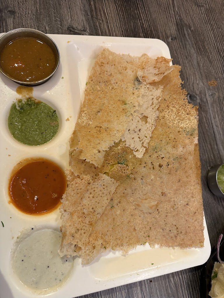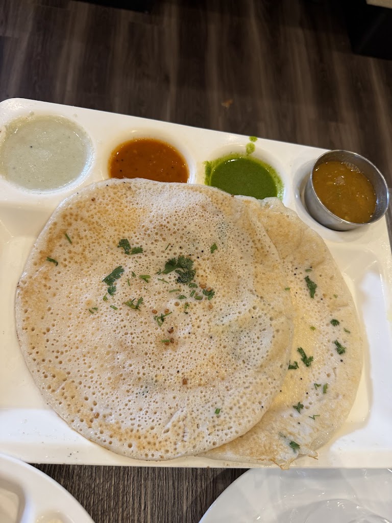 We ordered Onion masala dosa, butter garlic dosa and paneer bhurji dosa. I had the onion masala dosa. The masala tasted fine and the dosa was crispy and good too but the onion was just thrown over the masala rather than being incorporated in the dosa which i didn t like. The food was good otherwise but the coconut chutney seemed a bit off. The rasmalai was $5.99 but was rather little for the price point. Our server was Papu who was really good in his service. He was courteous and friendly. Shoutout to him for being a good host.