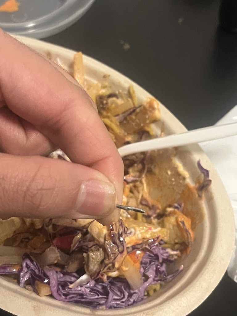 I ordered chicken rice bowl from Uber eats from this location. I found a foreign steal object in my food which caused cuts inside my mouth. such a terrible service.