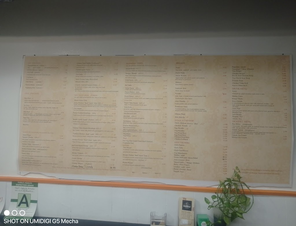 Food is impeccably delicious. Especially the curries. But some items are ridiculously overpriced. $18.99+tax for a small container of butter chicken is insane. You don t have to pay that much even in a star restaurant for that QUANTITY.
