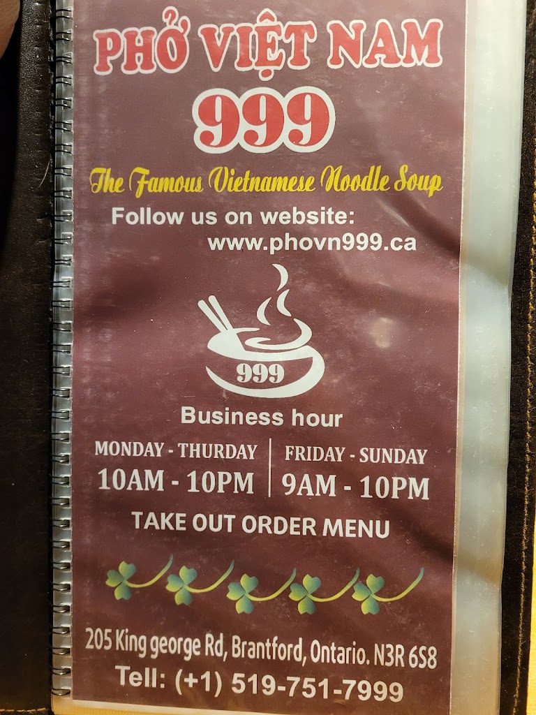 PHO VIETNAM 999 BRANTFORD IS TOP NOTCH! Hands down the best pho Ive had from London to Hamilton. The apps are amazing the food is great! I normally get 5 cream cheese wonton 1 crab claw 2 shrimp and pork vegetable rolls 1 large beef and brisket rice noodle soup Absolutely delicious I have posted pics as well. The service is absolutely amazing everytime they are great people. Price is 5-star Taste is 5-star Customer service is 5-star Atmosphere- 5-star If you are looking for a great place for pho this is it!!! I absolutely love this place and go once a week See you next Monday PHO VIETNAM 999 staff!!!
