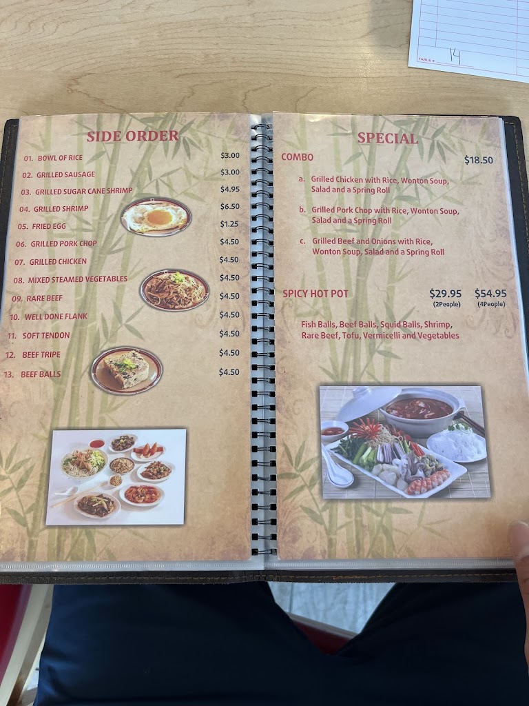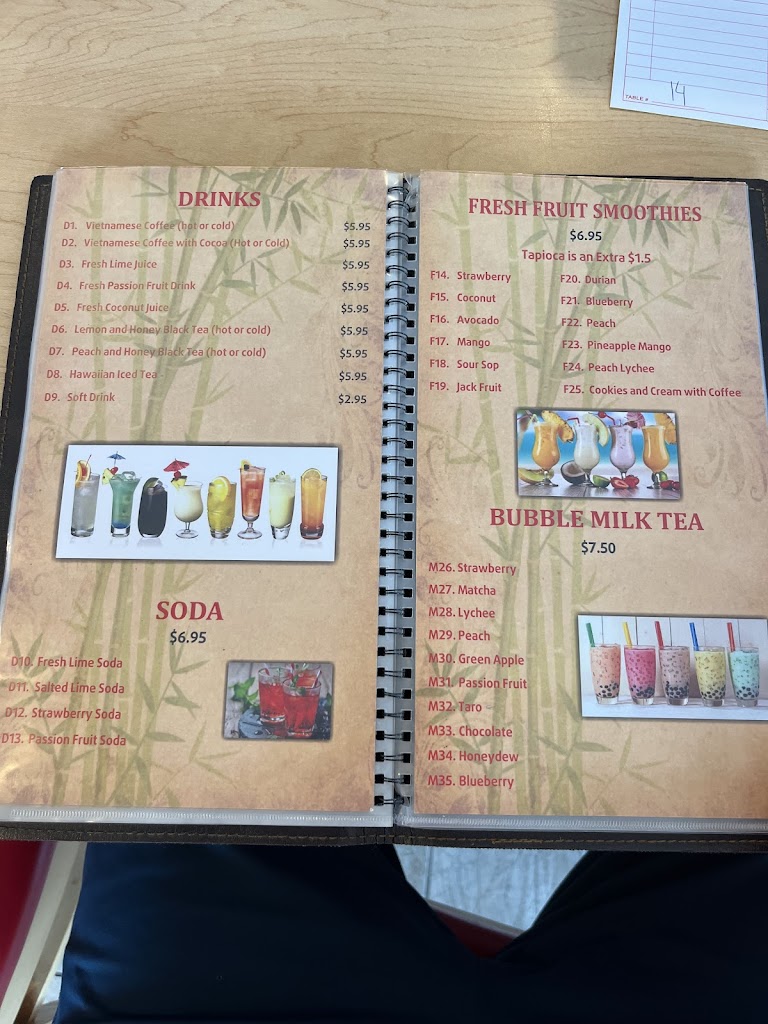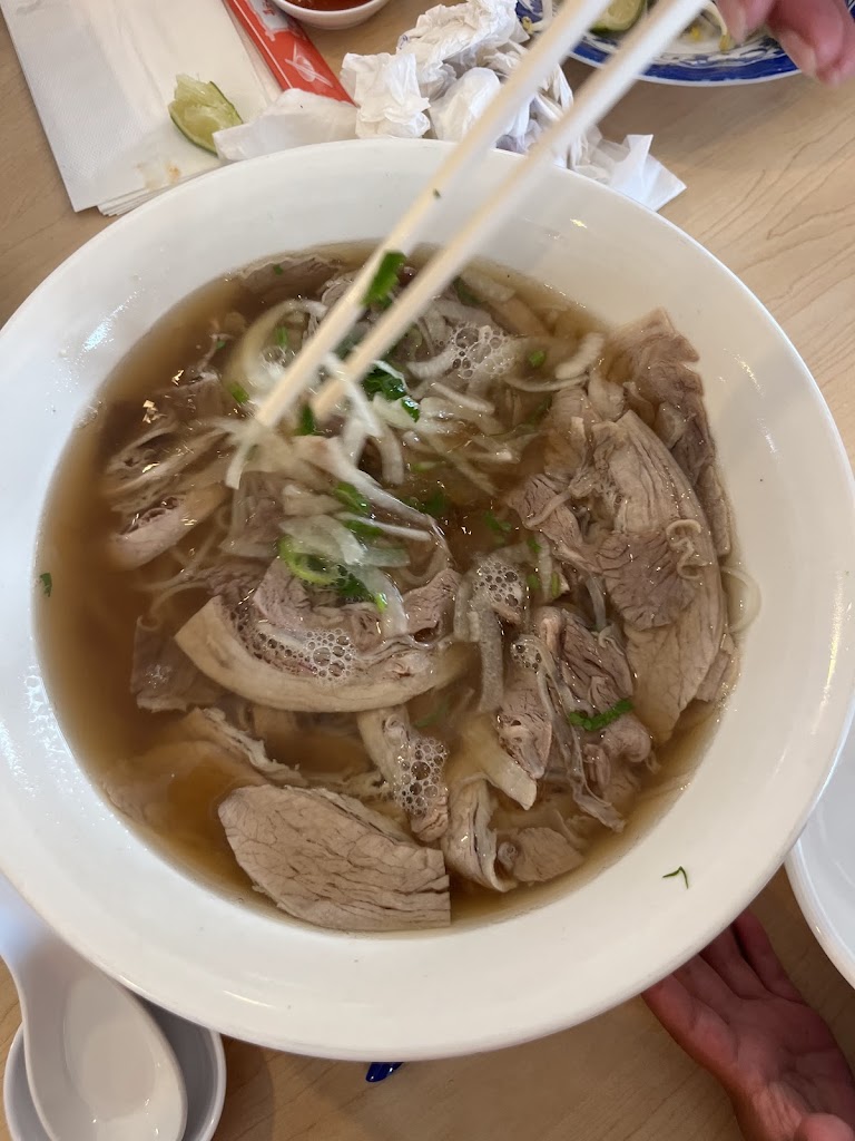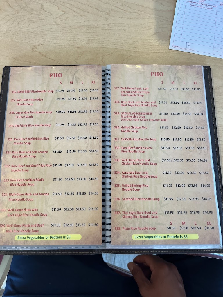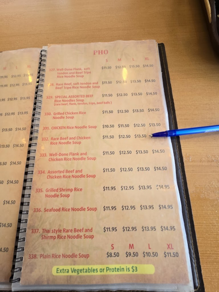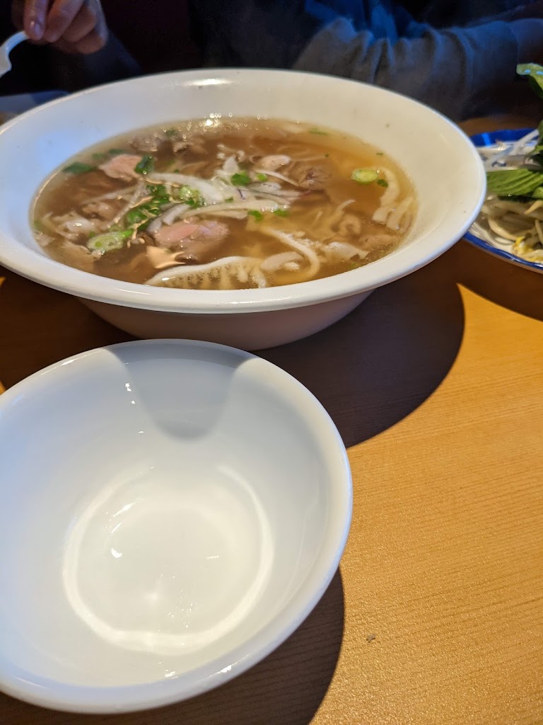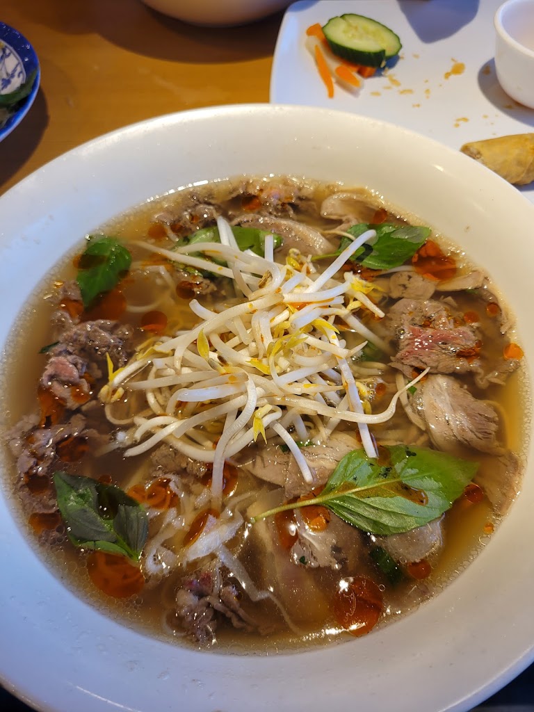 One of my favourite places for phô! I love the size options, their broth alone is really good. They have more sauce options, their drink selection is amazing (my go to is iced black peach tea with honey- chefs kiss). And I always get the crab claw to start because it s soooo good! My only con is sometimes the staff disappear to the back for too long so you end up waiting a little longer than usual (not often just sometimes) either way, love this place!