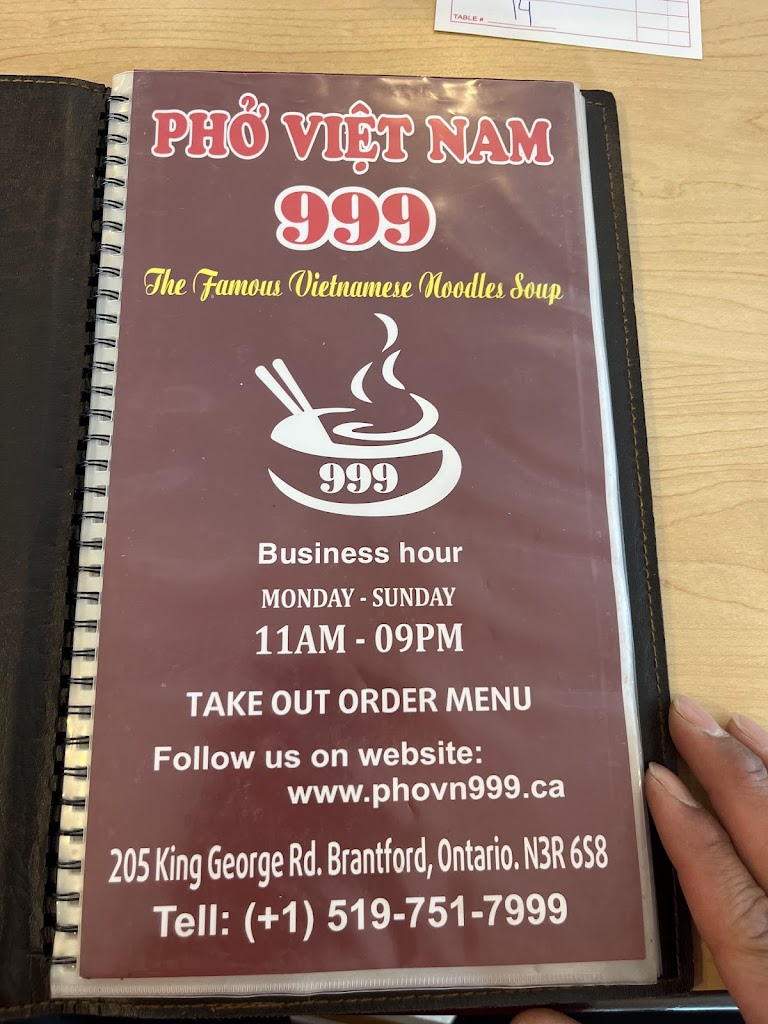 Our go-to restaurant in Brantford when we need a break from cooking. Ive been to Pho 999 about 50 times now with my wife, and Im ready to say its consistently excellent. Under this new management, the food is always just right, and the service is impressive. Its a family business, and these people are working hard to make this place a success. I see that the parents are cooking in the back, while their adult daughter runs the whole front by herself. Shes friendly, attentive, and smart: tonight I put my menu down after filling in my order, and she appeared literally 5 seconds later to pick it up. The food comes out quickly, and the recommendations are always spot-on. I tend so far to eat either the chicken and pork chop with rice or the noodles with chicken and salad. Both are as good as any Vietnamese place Ive ever tried in Toronto. My wife prefers the pho (soup) and shes always happy when we come here. The prices are totally reasonable, and I find the meats here better cooked and prepared than at the other places. When its late, or were tired, we go here. Its our go-to. So far, Im delighted to give these hard-working people my business and a good healthy tip.