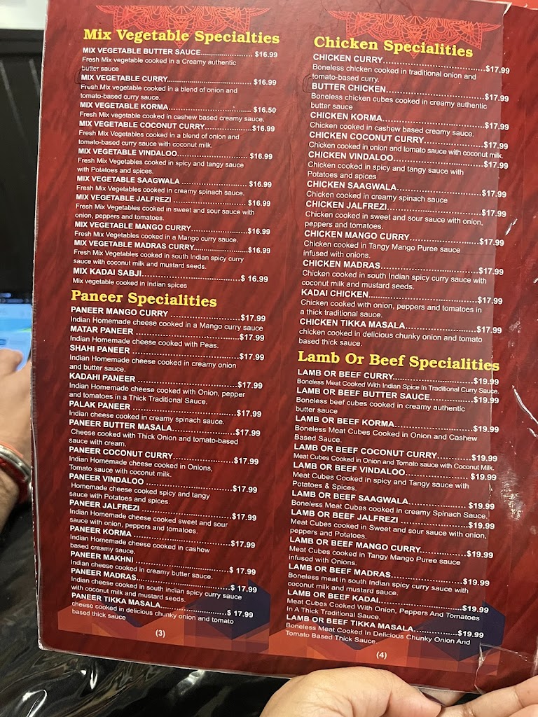 Amazing food, Great price, Clean and hygienic place. We enjoyed excellent Indian curries and bread. Food was fresh, well cooked and beautifully presented. Vegetarian options: Excellent Vegetarian options based on Lentils and Cottage (Fromage) cheese and freshly cooked breads.