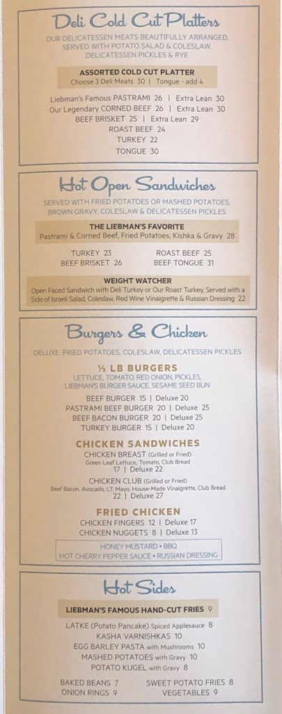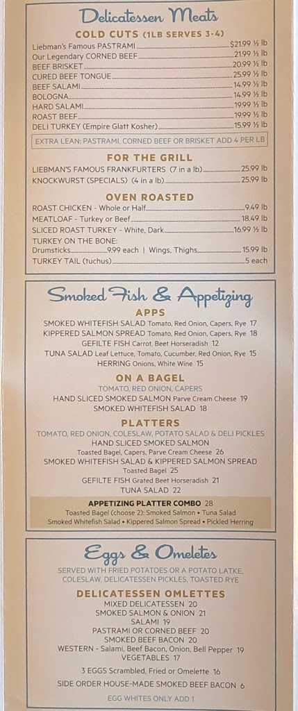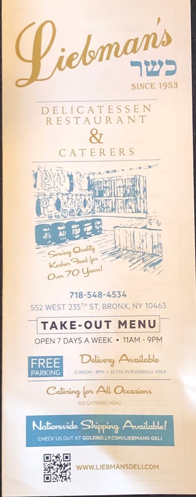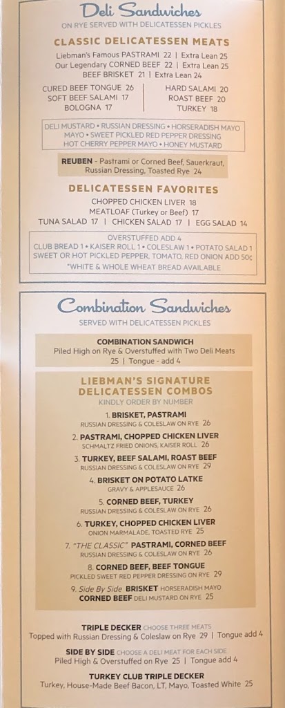 Can t get any better than this. I ve eaten at every Jewish Deli in NYC and beyond and Liebman s is the best! Awesome menu of everything you could want. Highly recommend you try this place out.