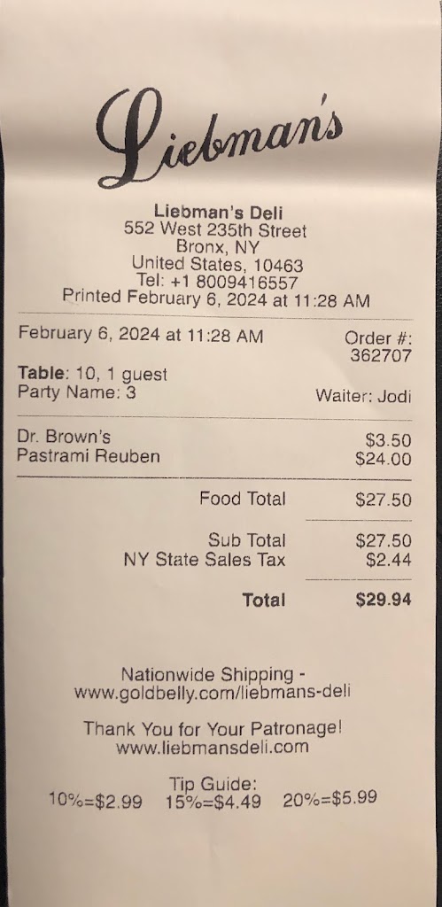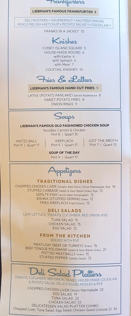 I ve been coming to Liebman s with my family throughout the years, whenever we get the chance, since we moved away from Riverdale 25 years ago. Liebman s continues to shine. The five of us enjoyed hot dogs, knishes, gefilte fish (my personal all time favorite), chicken soup with kreplach, pastrami and tongue sandwiches, and stuffed cabbage. We were in kosher heaven. If you are looking for an old time Jewish deli, Liebman s is your location. Inflation has not been kind to the prices, but to me it was well worth it. For non-locals, fyi there is free parking around the corner. Parking: Free parking around the corner, off Johnson Avenue.