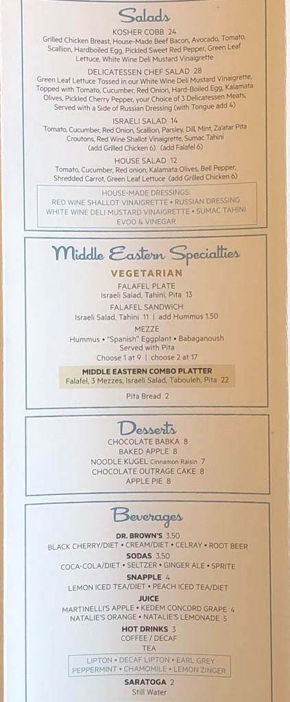 Delicious traditional Jewish Deli Vegetarian options: Salads and vegetables Dietary restrictions: Health conscious Kid-friendliness: Very kid friendly