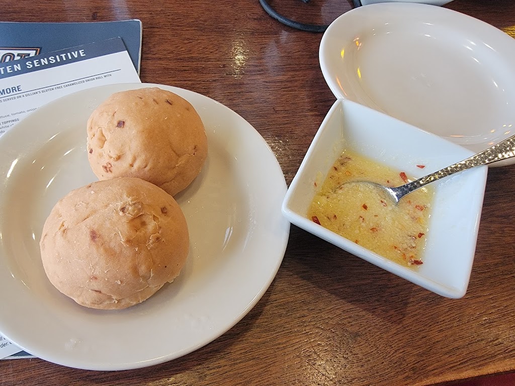 Had another great food experience! The host was super friendly and sat us promptly. Our server was also super friendly and when I asked if they had any glutrn free options he brought me the special menu and complimentary gf onion bread made in house that is so delicious. It was a but heavy but even my daughter loved it. She enjoyed the regular complimentary bread and cheesy oil dip. My daughter had the pulled pork sandwich with mashed potatos and coleslaw. I had the mustered crusted chicken sandwich with fries and coleslaw. The chicken was absolutely perfect and juicy. The crust was nice and crispy, but I did notice an overall mustered flavor nor the accompanying aioli. Our food came within a reasonable time and our waited was so great. Cannot wait until our next trip down