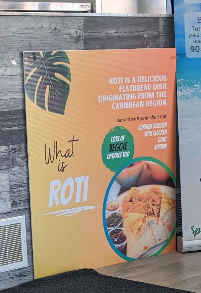 Really had high hopes that we would finally have a good Trini shop here in Burlington. Chicken roti flavour was nice and great cuts of chicken. Chicken was dry and the roti fell apart and couldn t even be held. Potatoes would have appreciated in the curry as they would have helped to soak up some of the moisture and likely have prevented the roti from falling apart. Doubles were too wet, too sweet, and very heavy on the Shado Beni. Pepper was the right level of heat, but was all heat no flavour, which as a Trini is disappointing as a good pepper sauce is a staple in every household. Overall, the chicken roti was very tasty and good value for money. The doubles @ $3 each are IMO overpriced for what you get. I will likely try a plated dinner next time as the curry would have gone great with rice. Vegetarian options: Plenty of veggie options to choose from! Parking: Street parking is available out front and around the corner. Wheelchair accessibility: Mall front is wheelchair accessible