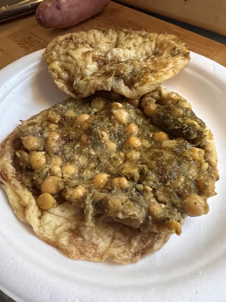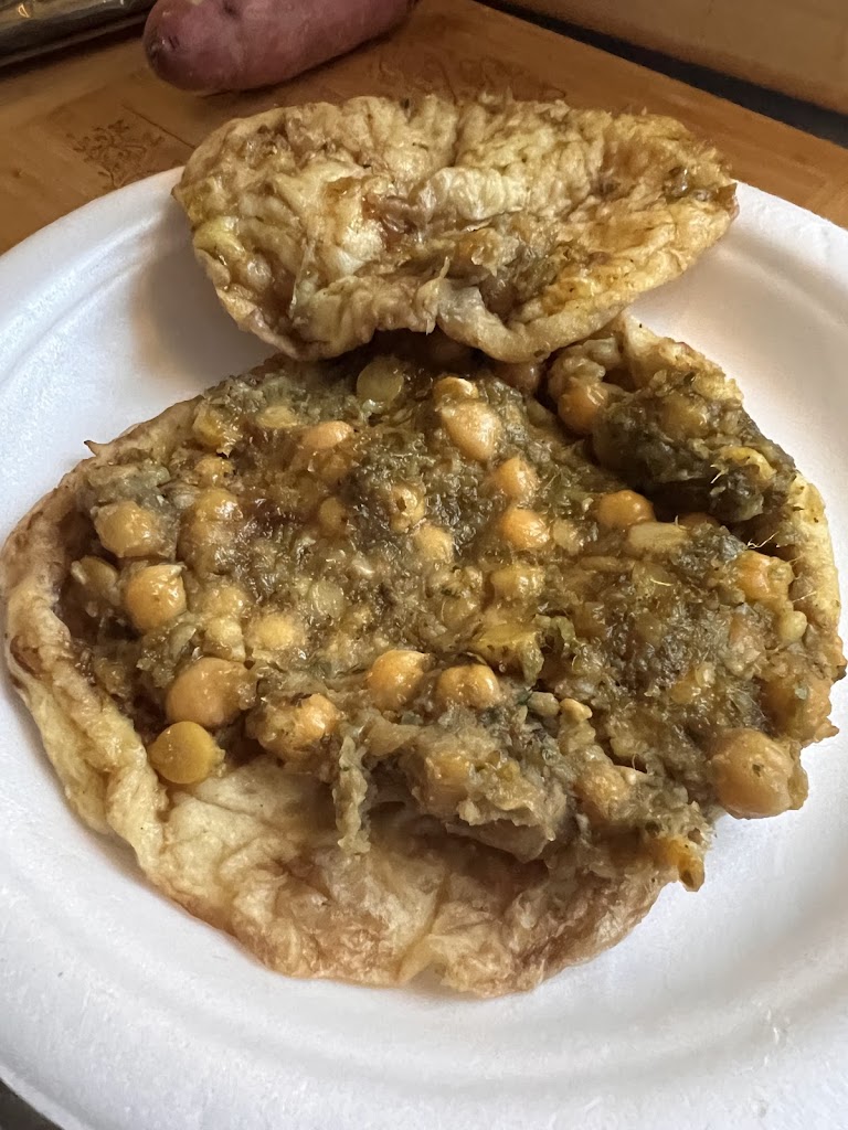 Solid food, could use potato in meat roti. Dhalpuri chicken roti is a go to. Some pieces of cartilage in left on chicken