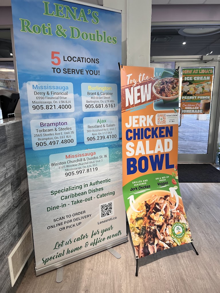 We were referred to Lenas Roti recently after feverishly trying to locate a Roti Shop in Hamilton, being relocated from Toronto. On1st calling the Burlington location, we were greeted so very pleasantly by REN, who guided us through the menu. After receiving said information, we had decided to visit the location. Upon arrival, we were pleasantly surprised by the visual appearance of the restaurant and its layout. We were then greeted by PANM, (Miss P), a most pleasant personality and welcoming guide, who provided taste tests as to enquiry, to make a decision, followed by REN. Being Trinis ourselves, we were very aware of what a good curry content should taste like. This was pallatibly wonderful, then decided to order 3 dhalpuri rotis, one chicken, one jerk and 1 goat returning home to savour. The experience was absolutely delectable. We will return for a most delicious and pleasant experience, both culinary and atmospheric welcoming. With much thanks to REN and MISS P, we will certainly recommend Lenas Roti to family and friends. Thanks 4 ending our yearning search for an authentic Trini Roti. WE FOUND IT! Doubles to come. Thank you, GeoSu.
