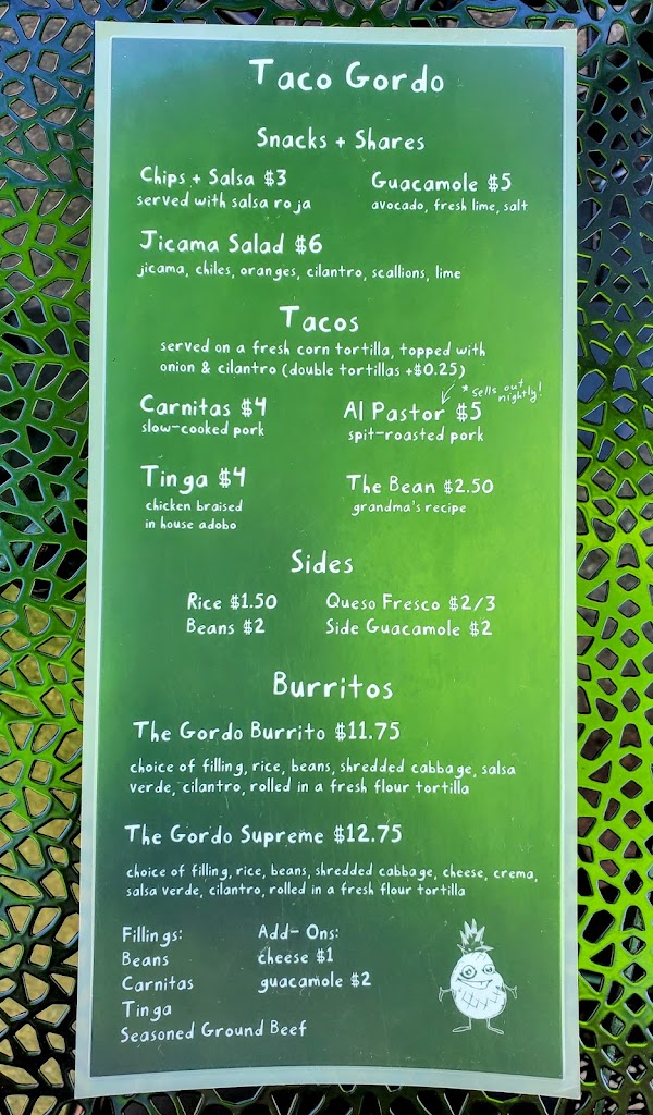 Taco Gordo is awesome! Their online menu is marked for food allergies, including gluten-free, which is great for me, since I have Celiac. I got the bean, al pastor, and chicken tinga tacos and they were all great. They were flavorful, but not overly strong, and the chicken tinga was one of the best Ive ever had! Vegetarian options: There are a few vegetarian options, mostly beans, which are very tasty. Dietary restrictions: The menu online is marked for gluten, vegetarian, and vegan, and the staff is knowledgeable about allergies/restrictions. They double checked with me that my gluten-free food could be cooked on the same flat top as a flour burrito (it could be, but I appreciated the effort). Kid-friendliness: If you are getting tacos, you order them individually, so its easy to adjust for a kids appetite.