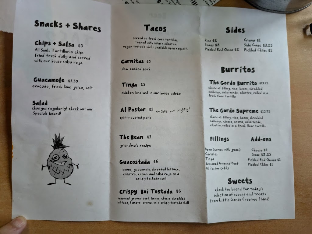 taco gordo is the BEST!! IYKYK Vegetarian options: awesome veggie selections and plenty for us carnivores too Food : 5/5 |