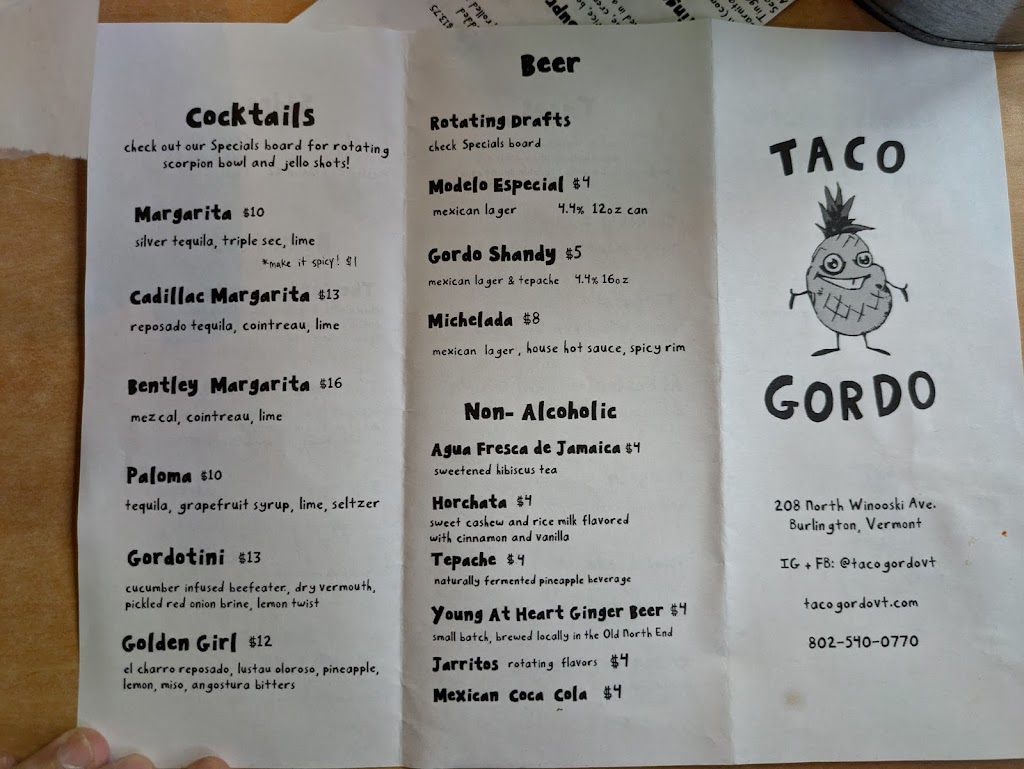 For years Mad Taco was the only option for authentic tacos in Vermont. Upon visiting Vermont for the first time in years, I am ecstatic to confirm that Taco Gordo has not only successfully dethroned Mad Taco, but has raised the bar with Al Pastor that would fool a Mexico City native. If you love tacos, youll love Tacos Gordo. PS: Im sure their burritos and other offerings are good too, didnt try, Im a taco purist.