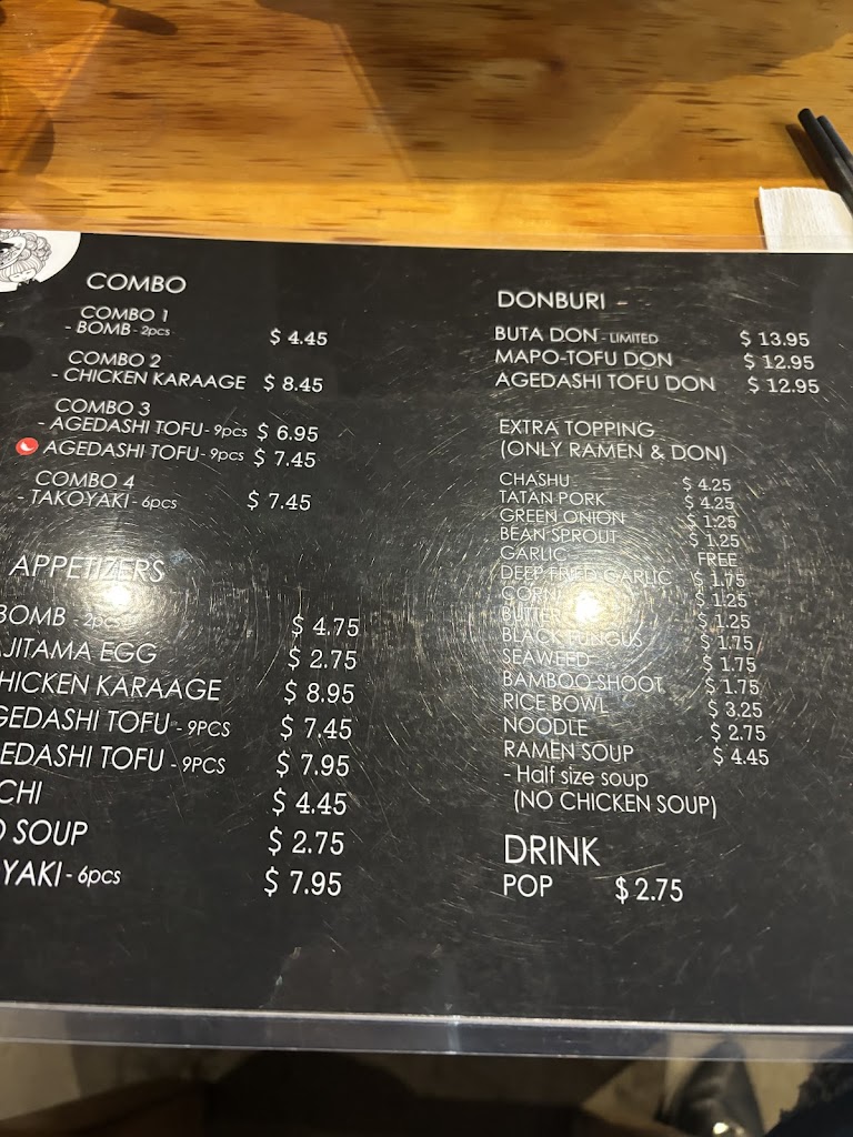Ive been to so many ramen places and this one just hits the spot! They have a good menu. Their bombs from appetizers menu are sooo goood! Its a must if you re there! It gets fairly busy but thats because their ramen is delicious! Worth the wait! Even their decor is niceee! They arnt just good marketers when it comes to promoting their business but their ramen is actually good! Try it! You wont regret it