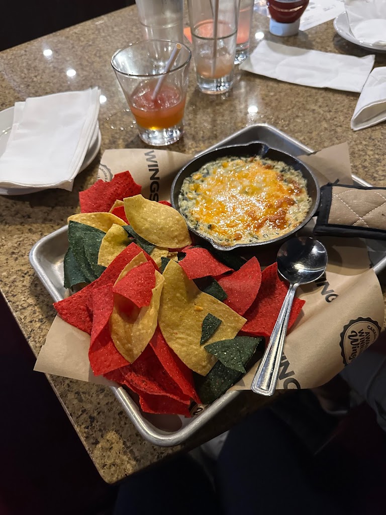 The food was delicious! Came quickly. We tried two different kinds of wings. (Salt n pepper, and BC honey Q) we also tried their spinach + artichoke dip. For desert, we had the warmed up cookie with ice cream & and caramel! Was AMAZING! 10/10 recommend an would definitely go again!!