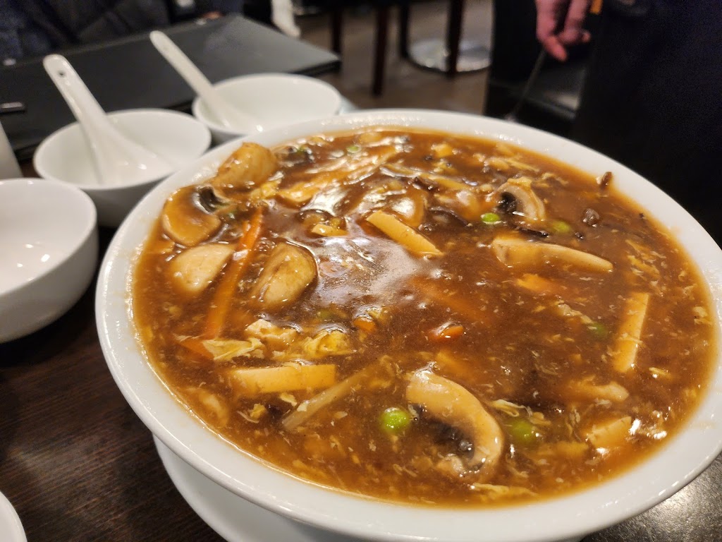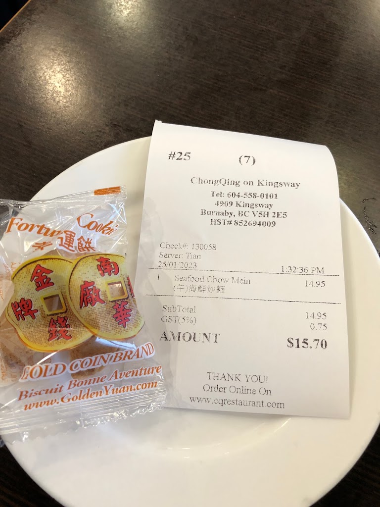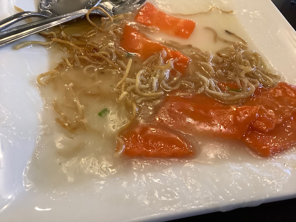 This restaurant has been around for years.. It is not a big restaurant with 5 booths, 1 large table and a banquet against the window with various 2 tops and 4 tops. Parking in front. They have an extensive lunch menu. The staff is efficient and friendly, for a Wednesday afternoon, the restaurant is 90% full with mix of clientele. Not all asians as I assumed. I ordered the Seafood Crispy Noodles including the Hot and Sour Soup. The food comes out fast, the soup is flavourful with the numbing spicy effect but the consistency is more like gravy, which is too thick to my liking. The Seafood Crunchy noodles indeed was very crunchy with 2 prawns, 2 pieces of small fried fish, 2 super chewy squid and a handful of eraser sized scallops and Bok Choy. The sauce over the noodles has the flavour but the seafood is bland, however again, the sauce, I suspect is made with an abundance of corn starch, so it’s super thick. At the end of the meal, you can literally see the sauce congealing into solid jelly. I do like the attentiveness of the staff, there were 3 servers always walking around, clearing and cleaning tables. They have their own napkins printed, and at the end of the meal, you get a fortune cookie, which reminds me of the old visit to their Broadway location when we used to eat there in the 80s. Most Chinese restaurants don’t offer fortune cookies anymore.