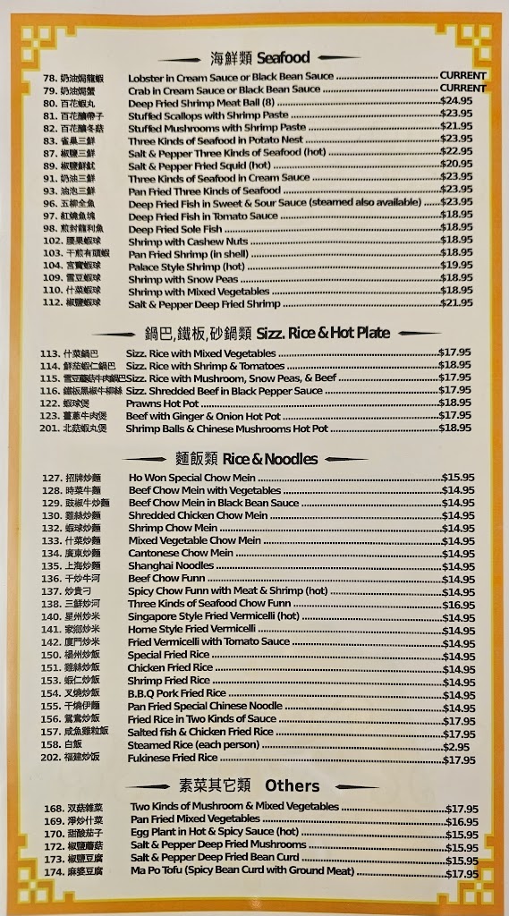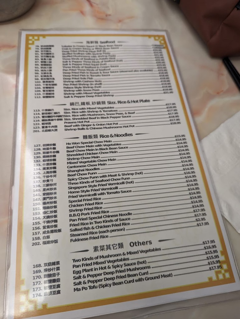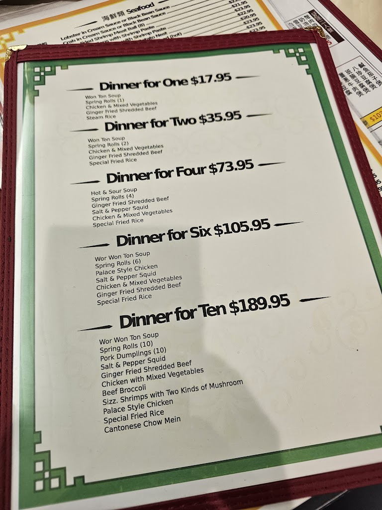 Probably our favorite restaurant for Chinese food for big family gatherings. Have been going since I was a child so for likely 25 years+. Best salt and pepper squid and lobster/crab in cream sauce for sure, it s a must get every time. Pro tip is to add fried noodles to eat with the cream sauce, so worth it. Just not the same without. We also enjoy the crispy chicken, house special chow mein, sweet and sour pork, ginger beef, snow pea tips with dried scallop sauce, seafood potato nest. Takeout is just as good. Service has been great the last several times we have visited. Place is not fancy but comfortable, lots of room. Recently saw that they have very inexpensive breakfast available for $5.99, will have to try one day (see menu posted).