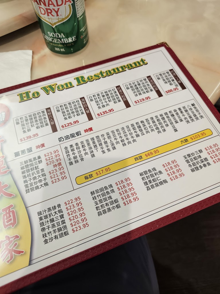 Ho Won has been around in YYC for decades, truly an institution. I love the fact that its located in Chinatown and has been at the same spot since they opened. Ho Won has always been consistent with their food/dishes and the prices are quite reasonable, not to mention the really generous portions. It pains me to say this but the reason why I give them three-stars is the fact that their take-out service is simply horrendous. I occasionally get take-out from here 2-3x a month and the wait times have been unacceptable. I call in advance with as much time/notice as possible and on average i find myself waiting at the restaurant for my food 20-30 mins after the estimated time I was given by to be there for pickup. I understand restaurants can have challenges keeping up with demand/orders so I try to be sympathetic to that; but the fact is Ive consistently had to wait 20-30 mins over the promised time for pickup and its beyond frustrating. For the owners if you see this, please improve on your pick-up service. I love everything else about your restaurant and want to continue supporting your business but the wait times for pick-up orders are inexcusable.