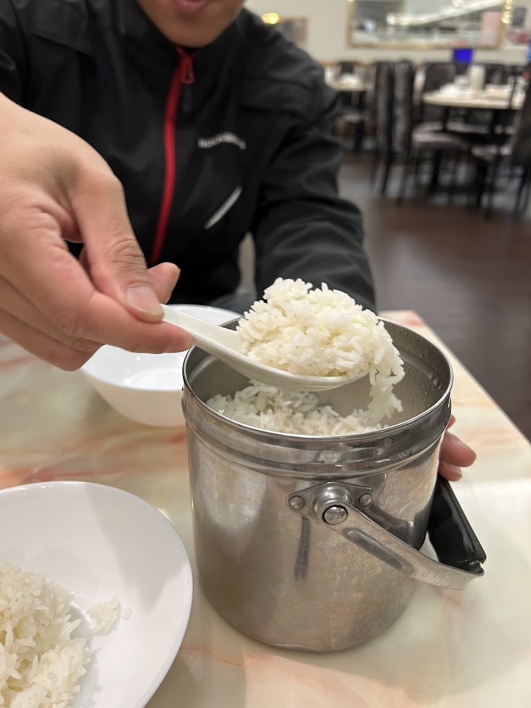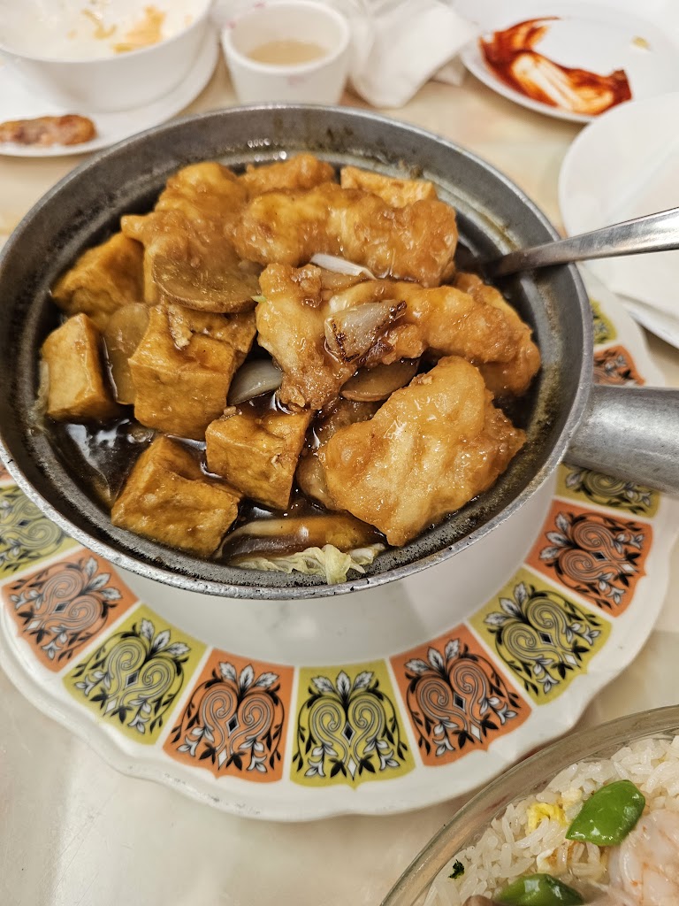 Food was ok at best. The sizzling rice with tomatoe sauce (pictured) had no flavor and was very disappointing. Asked the server for alternatives and she flat out told me off. Washrooms were gross and very outdated and grimey. Ps pooped every like 30 minutes.