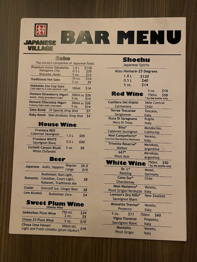 First time going to Japanese Village and we had a wonderful time! There is so much energy in the restaurant from all of the hibachis and their chefs. You can hear them singing and joking with the patrons, it is a very interactive experience and great for a larger group. I ordered the salmon, and my partner ordered the steak and shrimp. It started with a soup and salad, then rice, grilled vegetables and your protein of choice.After your meal you also get ice cream. With a few beers, our total with tip came to $120 which we thought was great. They are also very efficient, it only took one hour start to finish for our whole evening. I am sure it takes longer with a larger group (only 6 at our table). But it was nice that they were so efficient if you had plans somewhere else after. I am already excited to go again!