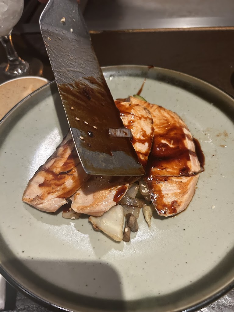 First I will say that my son, who was with me really enjoyed the meal, he ordered the teriyaki chicken. I ordered the teriyaki salmon. I am not a meat eater. I now know to ask the staff if my fish/seafood can be prepared before the meat dishes as I do not like my food mixed with meat juices. But my biggest complaint was the salmon was 3 thinly sliced filets which unfortunately were over done, and tough. Next time I will order the shrimp.