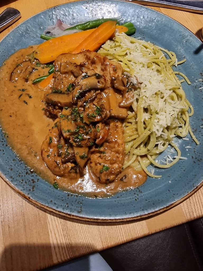 Stopped in on Friday of August Long and got a table right away. I had the portobello mushroom chicken and a week later, I m still thinking about it! It was so flavourful and delicious. The pasta it came with was great too! The kids loved their burgers. Hubby enjoyed his steak as well. But seriously, that chicken!! If you like mushrooms and chicken, this is your meal!!Drinks were great. Our waitress was attentive. Food came decently fast. Can t wait to go back to Calgary just to eat that chicken!!