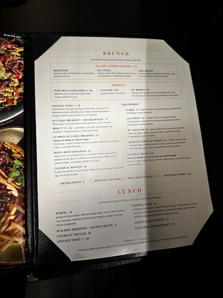 Update: The eggs Benedict, andoullie sausage and potato wedges never disappoint! Update: Milestones on Stephen Ave in Calgary has amazing bruschetta - fresh and flavorful, definitely a must-try. Theyve got a great selection of cold beers and wines for every taste. With tasty eats, drinks, and a cool vibe, its perfect for casual meet-ups or special nights out. Previous: I enjoy Milestones more for its breakfast menu. The eggs benedict classic is among the best Ive had. The grilled andoulie sausage is spicy and delicious alongside the flavourful potatoes. The servers are always attentive and kind. We typically attend every weekend for brunch, and the pricing is spot on for what you get.