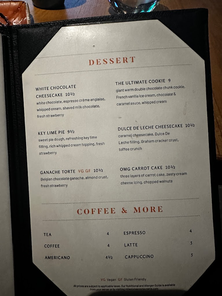 A Night to Remember at Milestone! Visited Milestone for a memorable New Years dinner and it exceeded all expectations! The Filet Mignon and Portobello Mushroom Chicken were absolute perfection. Despite the bustling crowd, the service was impeccable. A must-visit for outstanding food and exceptional service!