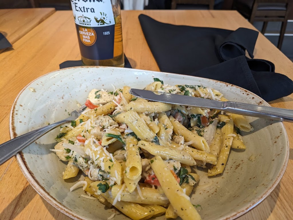 Love the food and the ambience here! First of all the ambience is super chill, they have tons of greenery all over the restaurant. Bathrooms are neat and tidy which is always nice to see. The service was wonderful, I forget my servers name but everybody was super helpful. I got myself the Pesto Chicken Penne Penne Asiago and they were super accomodating for my Gluten Allergy! Dietary restrictions: They have tons of Gluten Free Options, and if a dish isnt already Gluten free, then theres tons of ways they can still make it work.