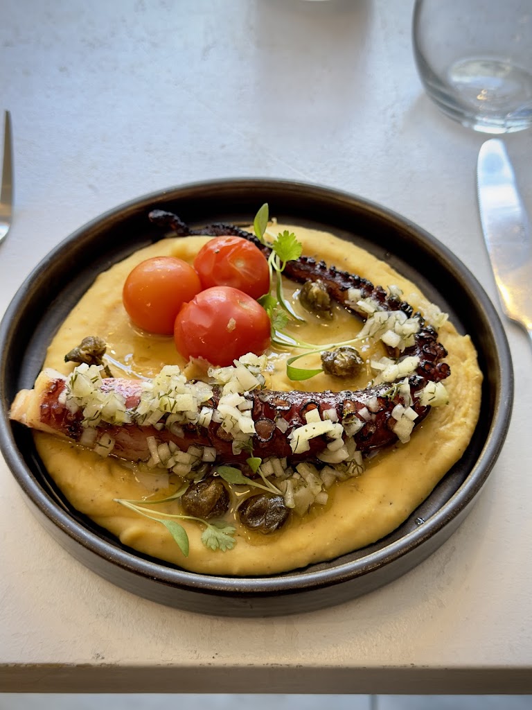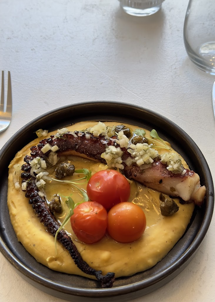 Its been not a first visit to Olive Grove. + Great selection of Greek food, olives and wine. Grilled octopus was not the best, but still good quality. (I would probably change the presentation of the dish.). Great wine - weve tried Malagouzia this time. - Table for us been offered only on ground floor. (strange later Ive discovered lots of available tables upstairs). So occasionally, you have to listen when delivery drivers are arguing with staff while waiting for online orders and they keep entrance door open so its a bit cold and windy. Wooden table been sticky, not sure if its a polish or table not cleaned properly. No one asked how was our food, no extra drinks been offered but waitress tried to clear our table twice with polite question Have you finished? even when our cutlerys still not been indicating it :)