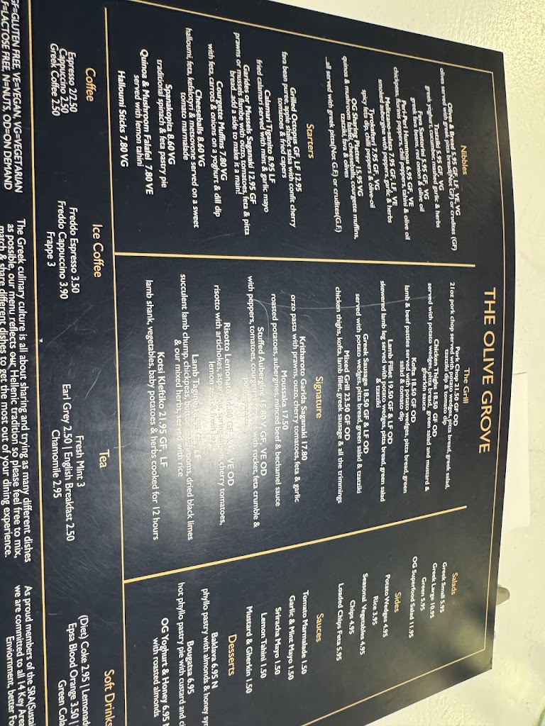 Search Google Images - The Olive Grove Cambridge. Now search Google Images for liminal spaces. You will find a match. The atmosphere and general design is particularly cold. The partion of people, the choice of wood for tables and chairs, the immediate dirt visible on the blue velvet like benches, and glaring stains on the white tables - the whole place is just not a vibe. Two of the staff definitely didnt contribute to it either. Im not sure I saw them smile once the entire time and after each interaction with one theyd converge meeting the obnoxiously large bar area and talk quietly - loud enough that you could hear something, but quiet enough that you cant make out what. Felt sus. The lady working there however was very friendly, props to her. Food was good though, get takeout if you can lol. On that note, they said they didnt serve some foods after 6pm, yet people came in to collect food that they said they didnt serve. Checking on Deliveroo, it was available. To make that clear, I could quite literally sit in the restaurant, ask to order an item of the menu, get told no, proceed to order it on the app for collection and then collect it at and then sit back down at my table. They played some good tunes too like Kendrick Not Like Us, but not exactly contributing to the atmosphere.