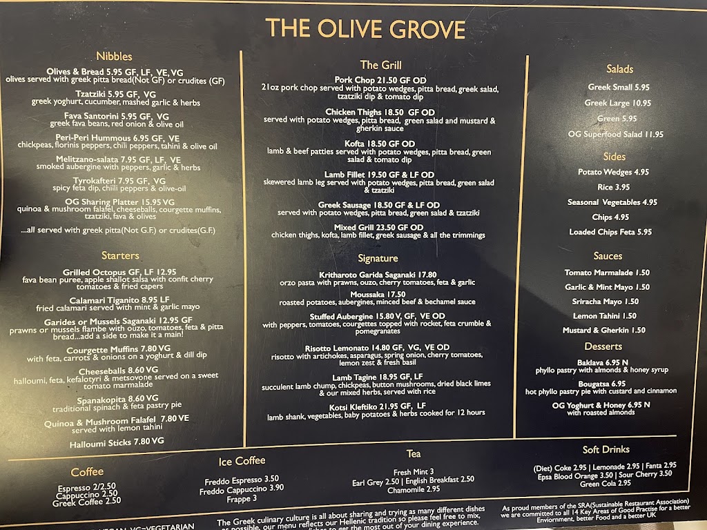 Had a voucher for The Olive Grove, so pleased we had it as without it we hadnt heard of the restaurant and we love greek food. Highly recommend, cosy venue, warmly greeted and efficient service. Lovely selection of food and generous portions, left feeling very full. Meat was cooked to perfection, sauce provided with main meal was delicious. Will definately return! Definately add the feta chips to your order!! Parking: About a 5min (ish) walk from paid street parking