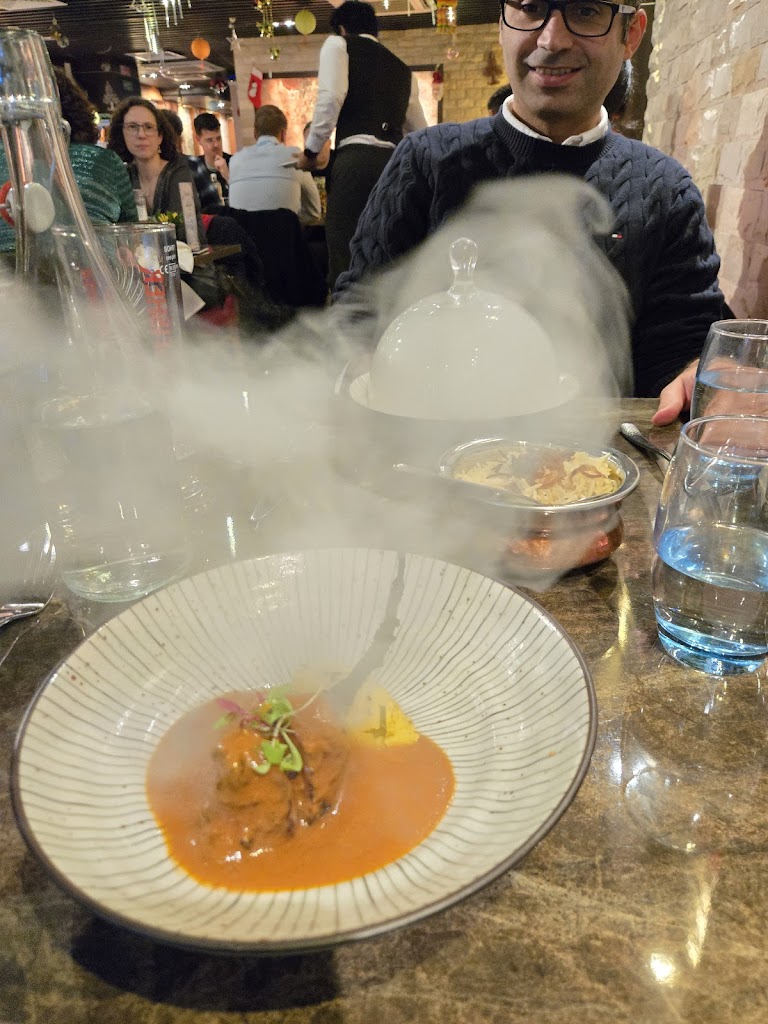 It was the best decision to spend our evening here! We had such a pleasant evening in the restaurant, from the greeting from the waitress to the treatment, everything was perfect! ;-) We were assigned a table even though we hadnt made a reservation (the restaurant was very full). After we were seated we ordered a drink. I took a freshly squeezed lemonade and my colleague a Cola Zero. There was a small starter with papadums and 3x different homemade dipping sauces. A sweet sauce, a fresh one with mint and a slightly spicy hotter one. All 3x sauces tasted wonderful with the papadums. :-) As a starter we ordered the broccoli with hummus to share. It was an incredibly interesting taste combination between hummus and broccoli, you can definitely try it. When we ordered the main course, our order was read out once to see if everything was correct and we were also asked if we were allergic to anything. Ive never experienced it like that before, but it was actually nice because you respond so much to your guests. ;-) When my Nalli ka gosht arrived and also my colleagues Malabar prawn curry, both of which are highly recommended, I was blown away! Just the way it has already been garnished and served is fantastic. *.* The lamb was so tender that it practically fell off the bone and the sauce had a very interesting taste. Nice and spicy, but not too spicy, just right. ;-) Every now and then we were asked whether everything was okay and whether we needed something to drink. A real service that greatly appreciates each and every one of its guests. While paying we were given nice warm cleaning cloths to clean our hands. The atmosphere is really chic and there were several Michelin star recommendations on the wall, which suggests that this restaurant might get one. If you ask me, it definitely deserves it! ;-) I can highly recommend everyone to have eaten here at least once, especially if you like Indian, this is the right place for you :-) Parking: There are parking spaces in front of and around the restaurant, although these may be full depending on the time of day. You have to get a parking ticket from the machine if you park within the specified time.