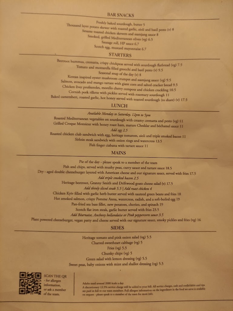 The interior design is a great improvement from when it was Loch Fyne and there is much better use of the space. The service is always lovely, the staff are welcoming. The menu has plenty of options however only 2 mains for vegans: Roast squash gnocchi, chestnuts, sage, toasted seeds and Potato & beetroot curry, candied cashews, coconut rice, kale pakora. The 2 vegan dishes that were on the Loch Fyne menu were also gnocchi and curry so it feels lazy that they re so similar. They could definitely add some more interesting and tastier plant-based dishes. They re not necessarily bad at the moment, but are lacking that OOMPH I get from the other dishes. Although, everything else I ve tried from the menu has been delightful so far. Here s some starters I recommend: Potted duck & pistachio, orange marmalade, truffle butter, brioche (however the brioche could be served toasted, or change the brand) Burrata, roast beetroot & orange, toasted hazelnuts, salted cracker Crab Thermidor tart, crispy kale (beautiful!) Smoked mackerel arancini, Parmesan, chipotle aioli If you are to visit as a group, I highly recommend ordering a few starters and maybe 1 or 2 mains to share between you rather than getting 1 starter each and a main each. The mains are good, but the starters are amazing and you wanna try as many starters as possible. It s also more economic. From the mains, give these a try: Crab bisque linguini, Romano peppers, basil, Parmesan Maple glazed porchetta, smoked garlic potato, puffed crackling, apple gravy Tandoori mutton pie, saffron crushed potatoes, mint yoghurt Overall, I was very impressed with the quality of the food and the service. It may feel expensive, but come in Monday-Friday between 12 and 6pm and there is a set menu available: 2 courses for £20, or 3 courses for £25. PLEASE change the vegan options and add more of them. It wouldn t hurt to get rid of one or two meat dishes and have 4 vegan dishes. Your vegan customers will be very happy about it, I m sure, and you ll have more omnivores going for the vegan option too. Another complaint I have is the music, it wouldn t hurt to refresh the playlist every once in a while. Play more sophisticated music: smooth jazz, ambient, soul, etc. I d be happy to make the new playlist for free! Great job with the new place, guys. I will definitely be coming again, thank you!